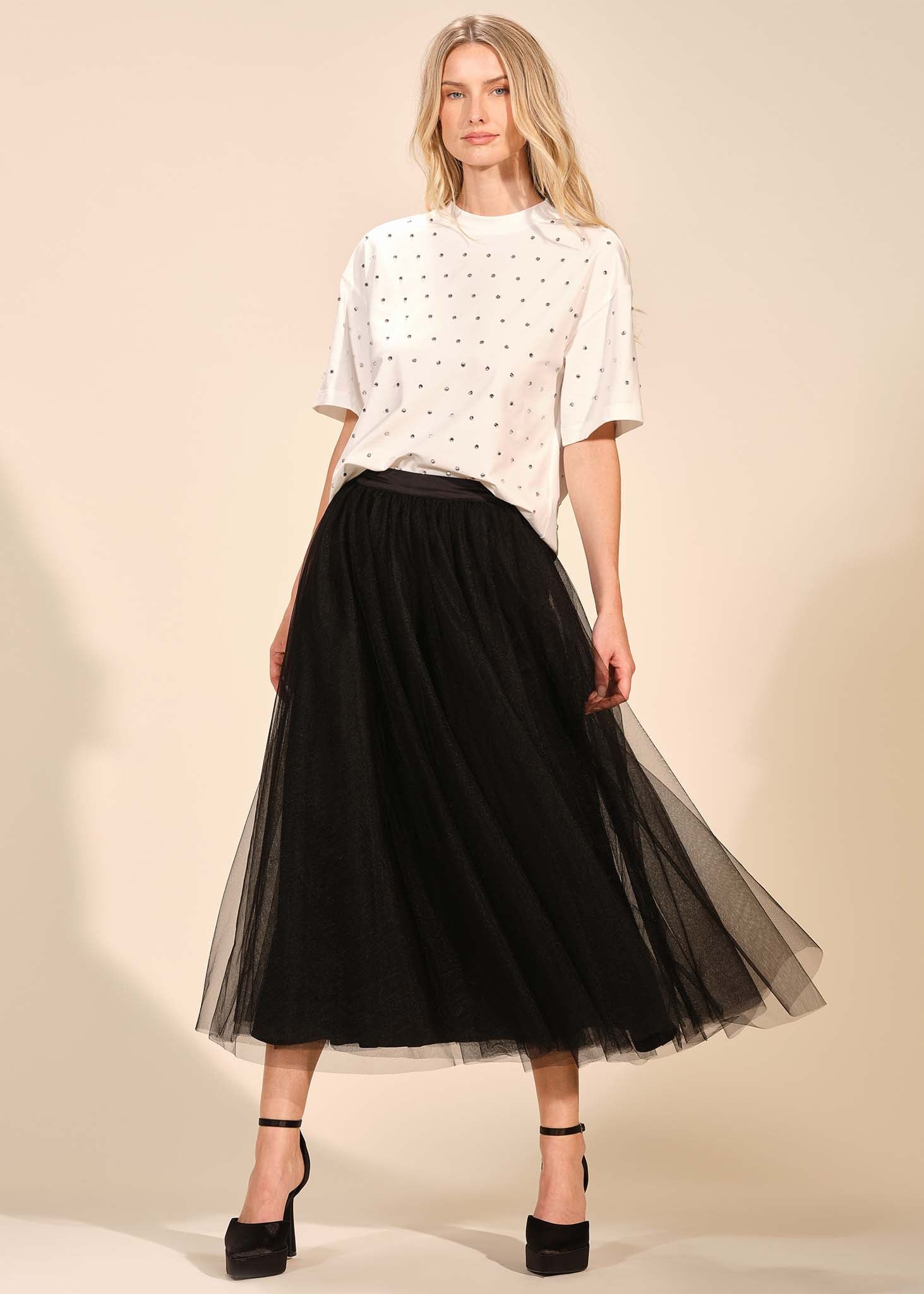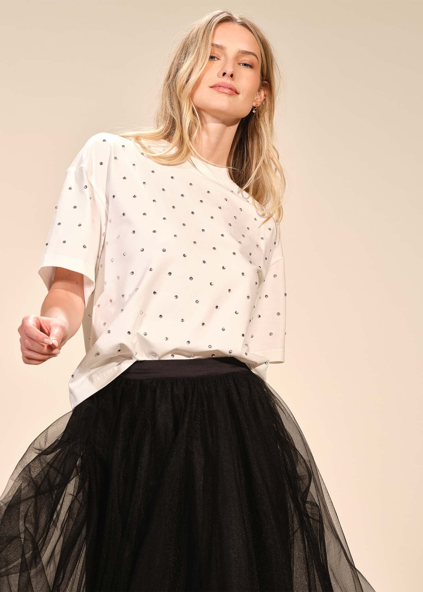 Ready to dazzle and shine? Meet your new wardrobe sensation: the Rhinestone Tee Shirt. This little number is all about making an entrance and leaving a trail of sparkles wherever you go. Perfect for when you're feeling a bit extra or just want to add a dash of glam to your everyday ensemble. Whether you're heading to brunch or a night out, this tee is your go-to for effortless chic with a glint of glamour.