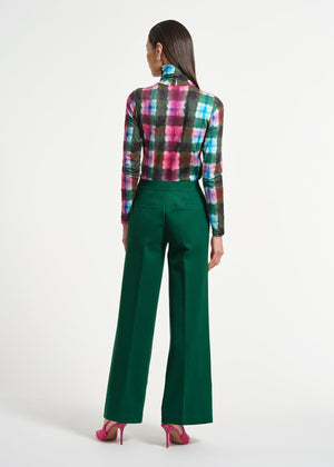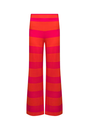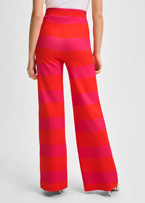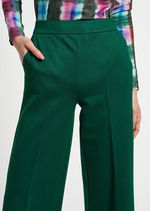 Easy, flowy knit pant with wide leg are elegant for day or night. Elastic waistband, smooth at hip.