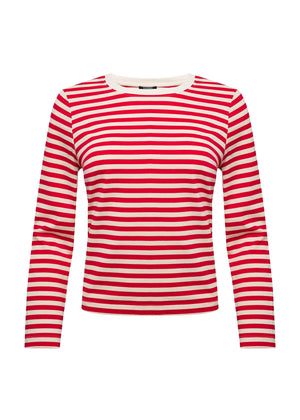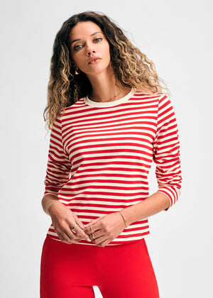 The Stripe Long-Sleeved Ringer Tee has a boxy fit with a comfortable stretch that flatters the figure while offering ease of movement. The scoop neckline is beautifully highlighted by a contrast color neck trim, adding a touch of refined detail that is both subtle and striking a nod to Mizrahi's flair for combining classic shapes with unexpected accents.