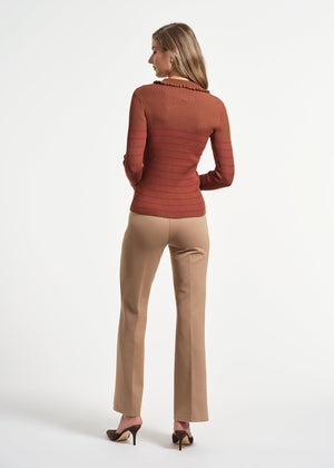 Oh, the Ruffle Neck Stripe Henley Sweater — where classic meets a dash of flair! This sweater is your go-to when you want to feel cozy yet effortlessly chic. The ruffle detail adds a touch of whimsy, perfect for days when you need a little extra pep in your step. Pair it with your favorite denim for a casual day out, or tuck it into a sleek skirt for an unexpected twist at the office. Trust me, it's all about the attitude you bring to it!
